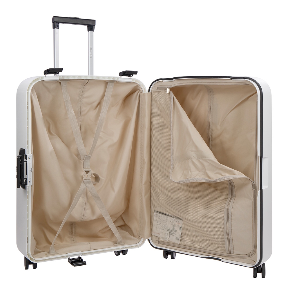 Vali Martino M316 28 Inch phiên bản White (Trắng) là hiện thân của vẻ đẹp tinh khôi, sang trọng kết hợp cùng sự vững chãi của một "pháo đài" di động. Lớp vỏ ngoài được đúc từ chất liệu nhựa dẻo PolyPropylene (PP) cao cấp, mang lại khả năng đàn hồi và chống va đập tuyệt vời, bảo vệ an toàn cho khối lượng hành lý lớn bên trong ngay cả khi chịu tác động mạnh trong quá trình vận chuyển.