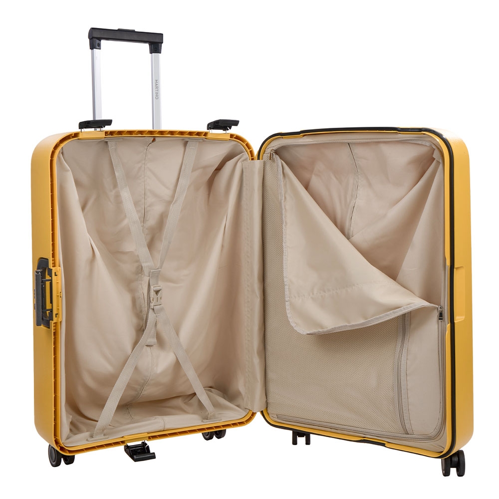 Vali Martino M316 28 Inch phiên bản Yellow (Vàng) là sự kết hợp hoàn hảo giữa không gian chứa đồ "không giới hạn" và vẻ đẹp rực rỡ, tràn đầy năng lượng. Lớp vỏ ngoài được đúc từ chất liệu nhựa dẻo PolyPropylene (PP) cao cấp, mang lại khả năng đàn hồi và chống va đập tuyệt vời, bảo vệ an toàn cho khối lượng hành lý lớn bên trong ngay cả khi chịu tác động mạnh trong quá trình vận chuyển.